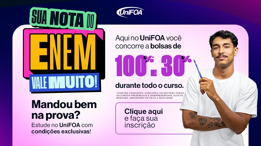 No UNIFOA, a sua nota do ENEM vale bolsa de estudos para o curso dos seus sonhos. Basta inserir a sua pontuação no formulário e descobrir o desconto que você pode conquistar.
