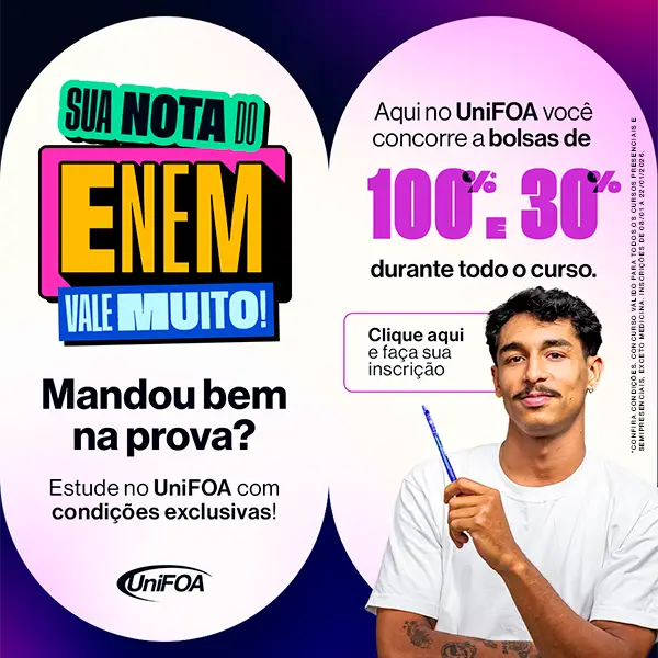 Use sua nota do ENEM, garanta a sua bolsa na UNIFOA e dê o start na realização dos seus sonhos! Preencha agora o formulário e descubra o valor do seu desconto. Seu futuro começa aqui.