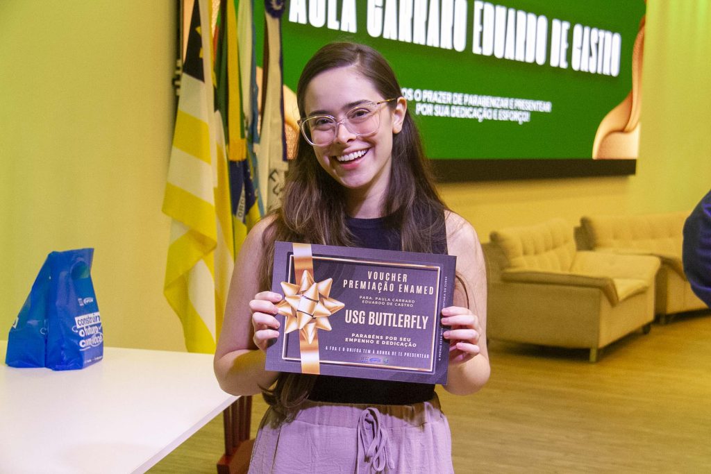 Entre os premiados, o destaque foi a estudante Paula Carraro, primeira colocada, que recebeu como prêmio um dispositivo de ultrassom portátil USB Butterfly — tecnologia amplamente utilizada no atendimento clínico e em emergências.