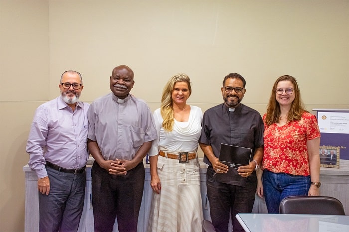 O encontro aconteceu na sala da Presidência, com a participação da reitora do UniFOA, Úrsula Fraga, da pró-reitora de Extensão, Ana Carolina Callegario, e do padre Manoel Barbosa, da Paróquia de São Cosme e São Damião, localizada no bairro Padre Josimo.